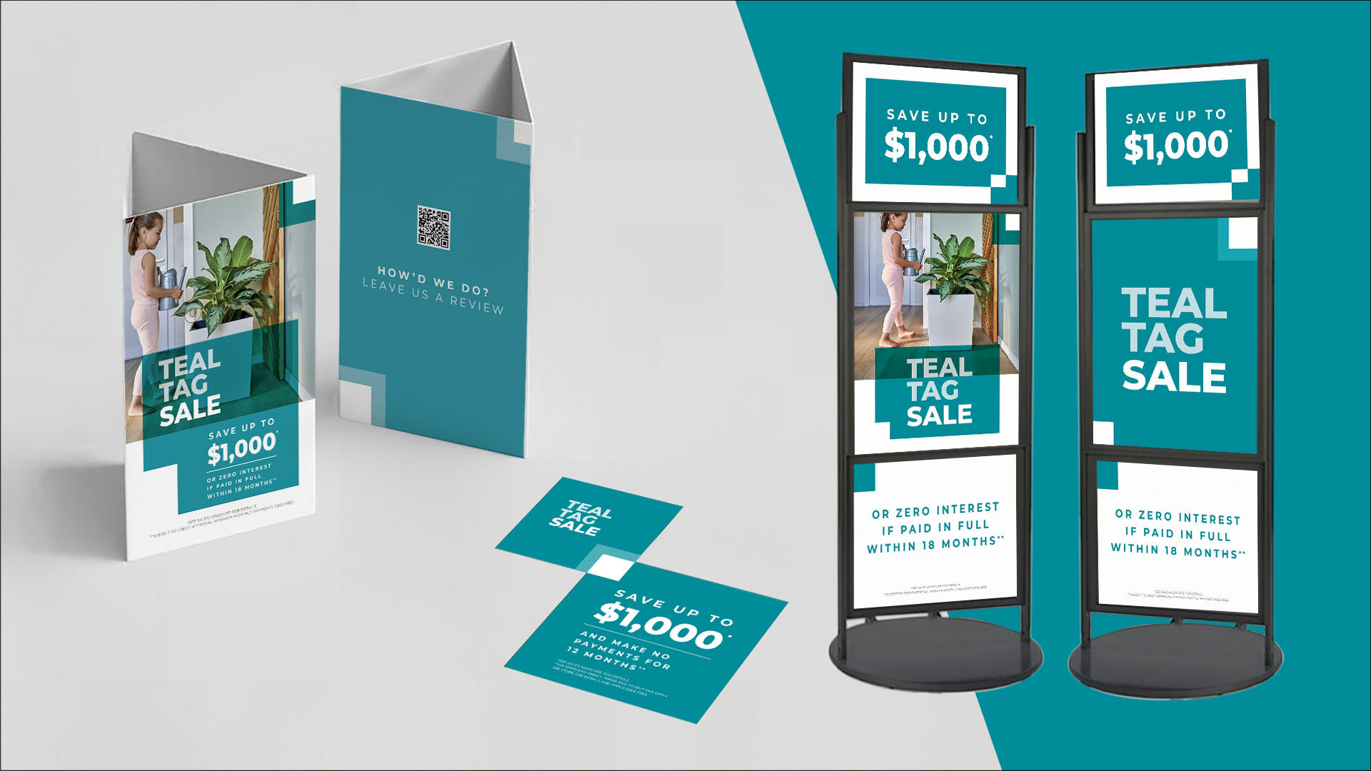 Direct mail and in-store graphics for the Teal Tag Sale, part of Carpet One's effort to supply store-owners with sales that they can run any time of year.